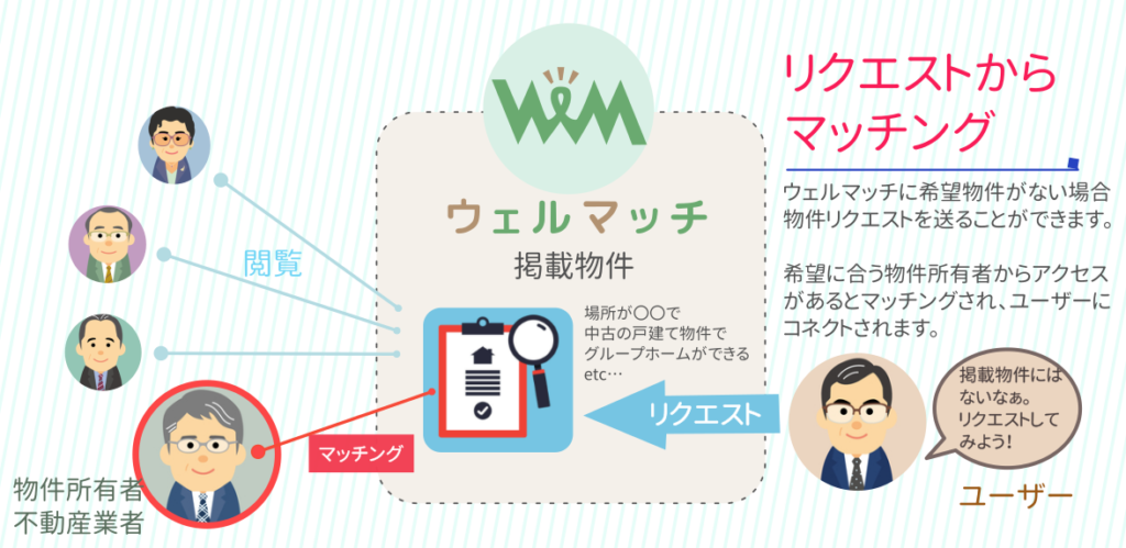 ウェルマッチでは空き物件を安定した福祉事業に使ってもらいたいオーナー様や不動産業者と福祉事業に対応した物件を探す事業主様とをつなげる役目をしています。