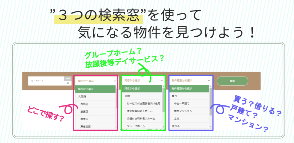 【場所】でお探しの地域を絞り込み、【対応】でやりたい福祉事業を選び、【物件種別】で戸建てタイプなのか、マンションタイプなのか、買うのか、借りるのかを選べばあなたのお探しの物件が見つけることができます!